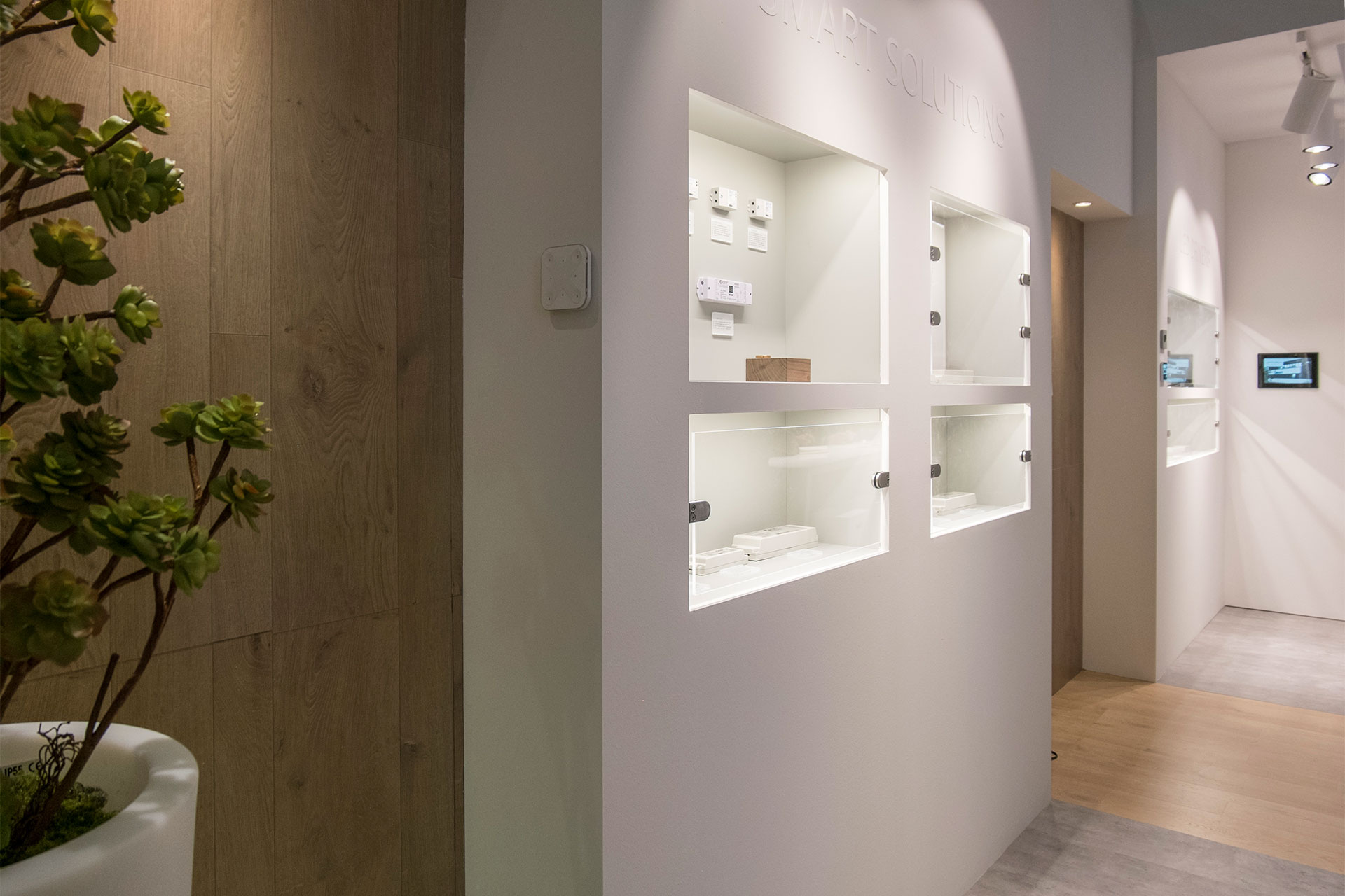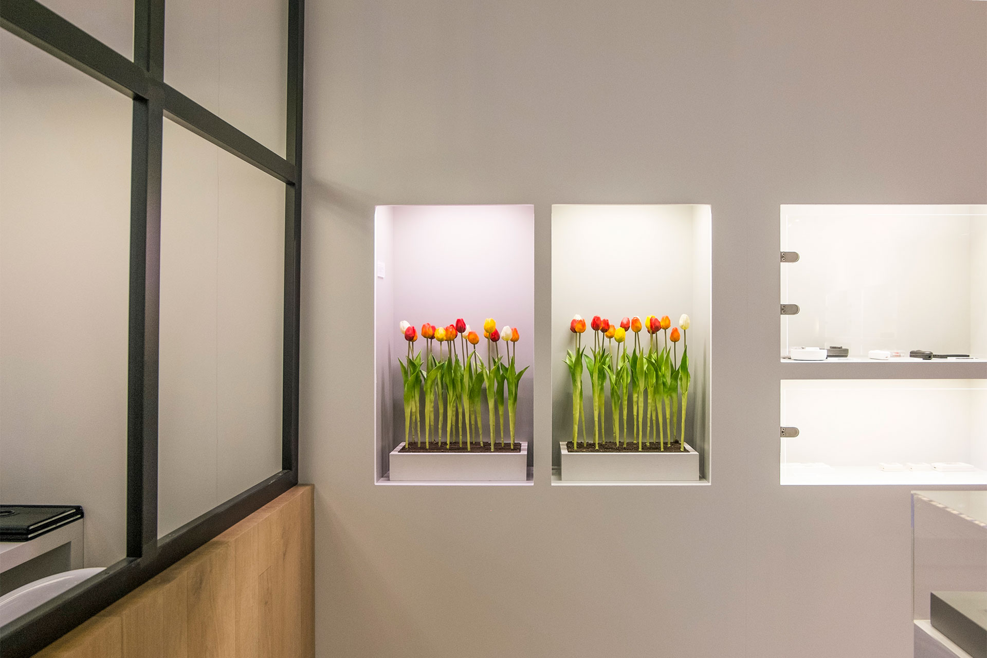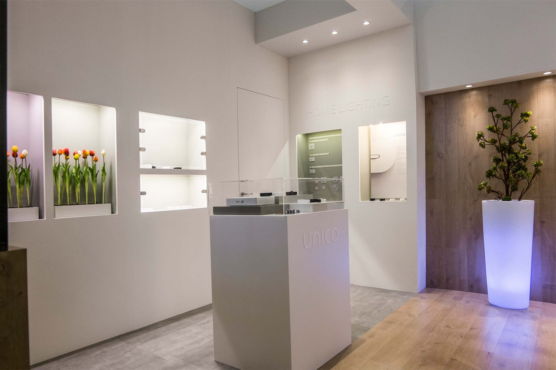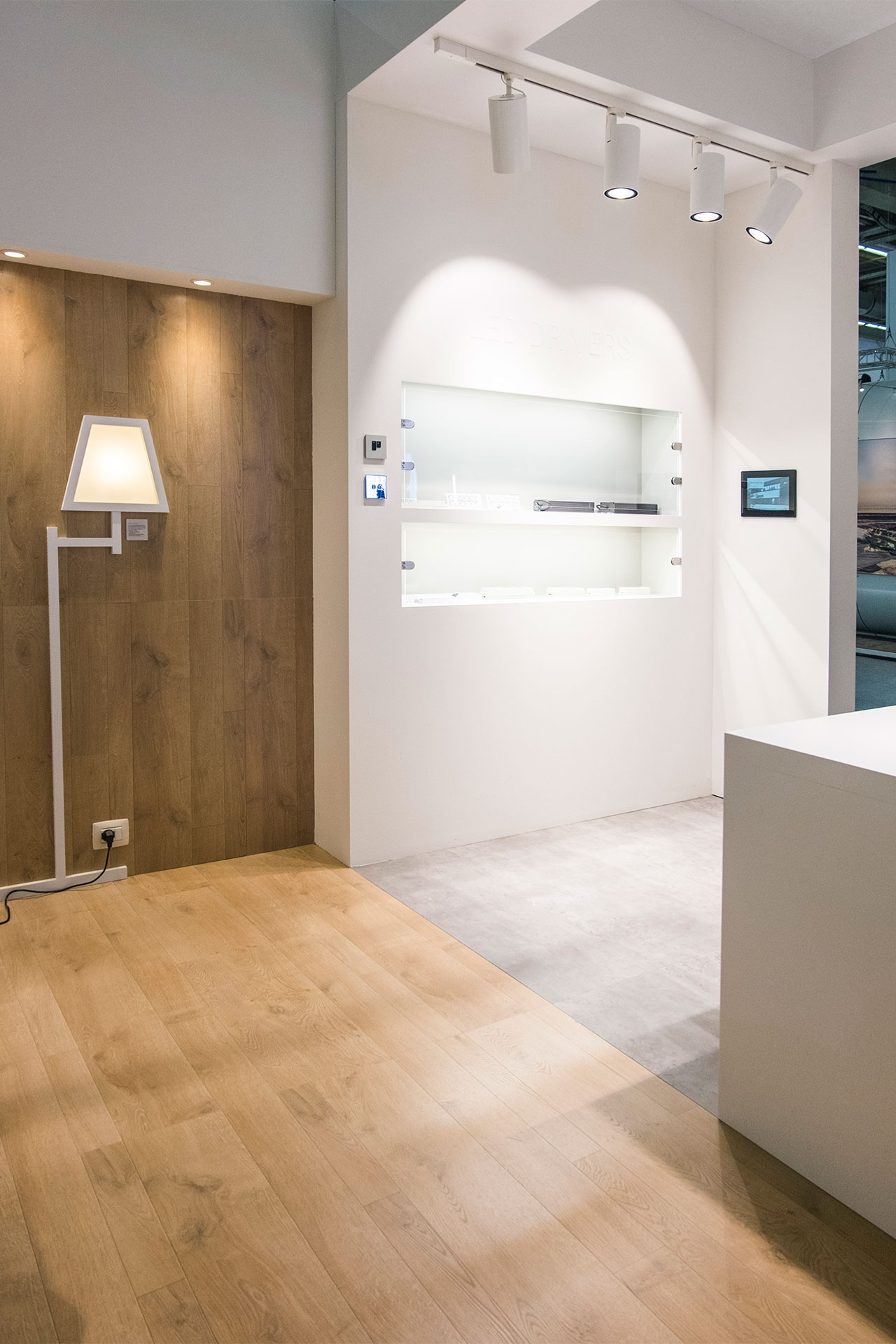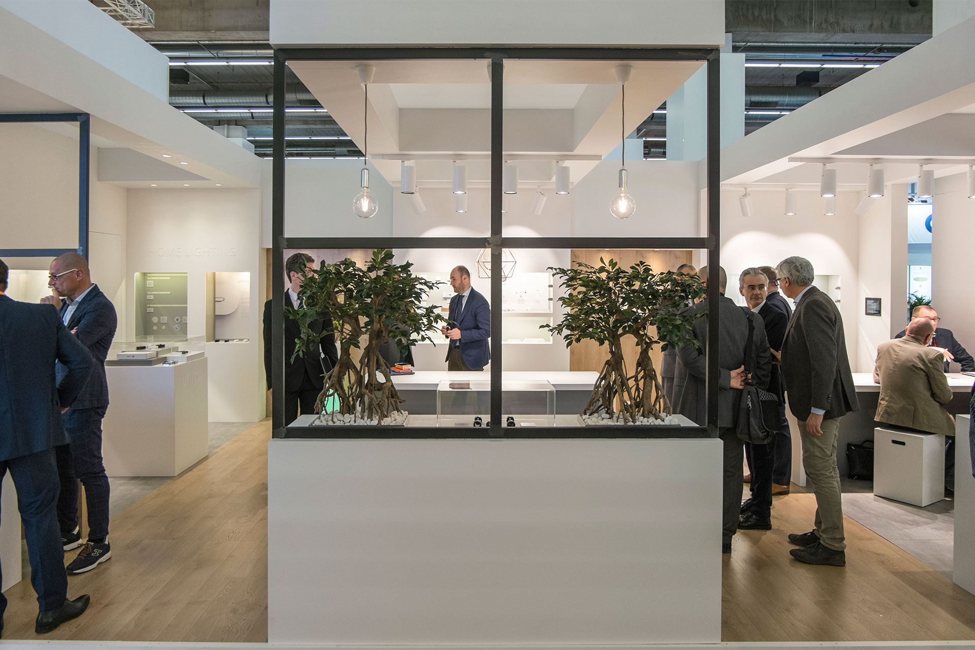 Exhibit project for Arditi Spa stand at Light+Building 2018. A booth with a domestic feeling and a geometric separations between spaces and products.