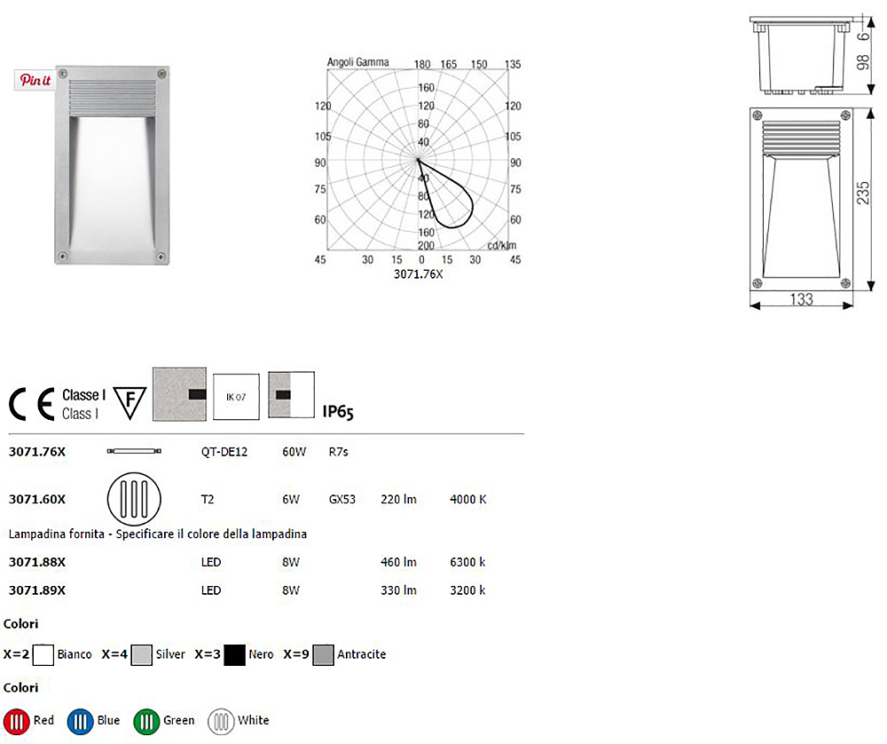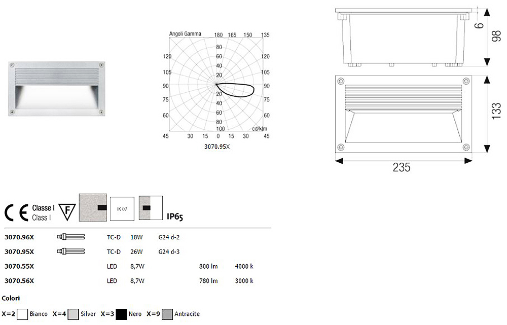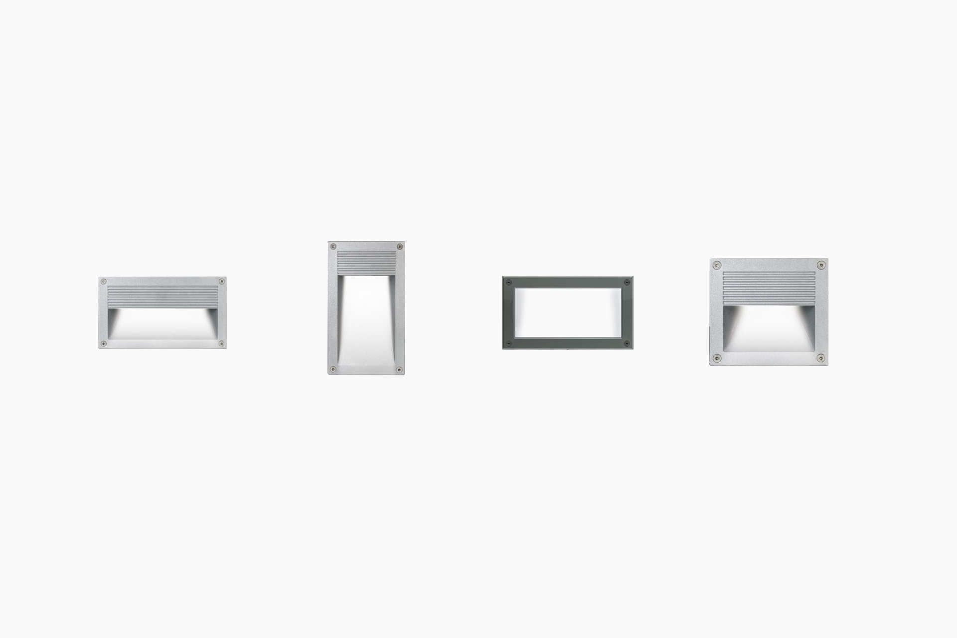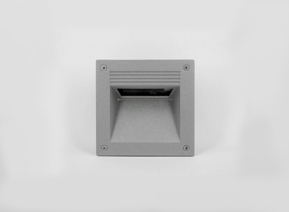 Recessed light for outdoor. Painted die-cast aluminium body,tempered glass diffuser, aluminium reflector, silicon gaskets, stainless steel screws, technopolymer wall holder.