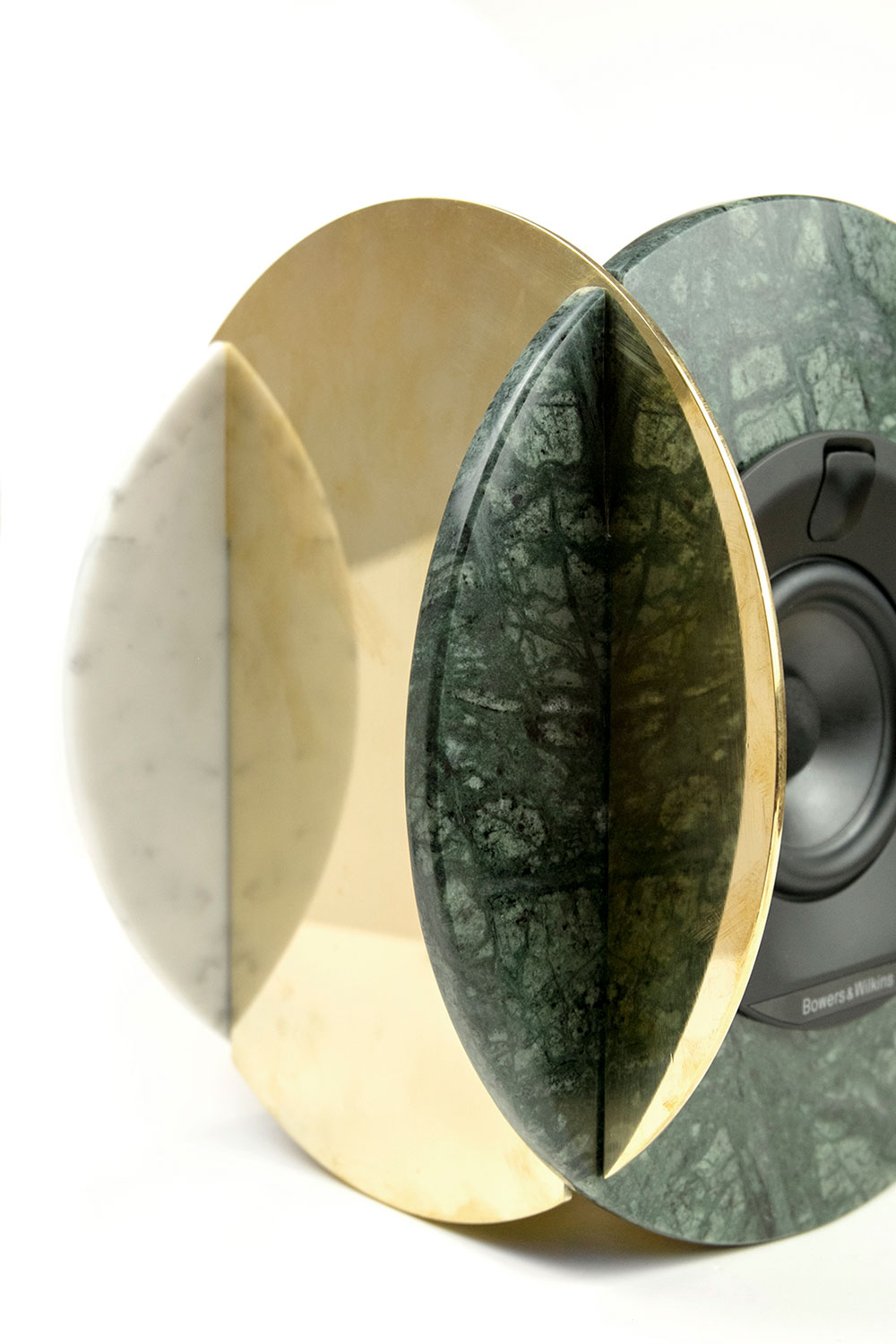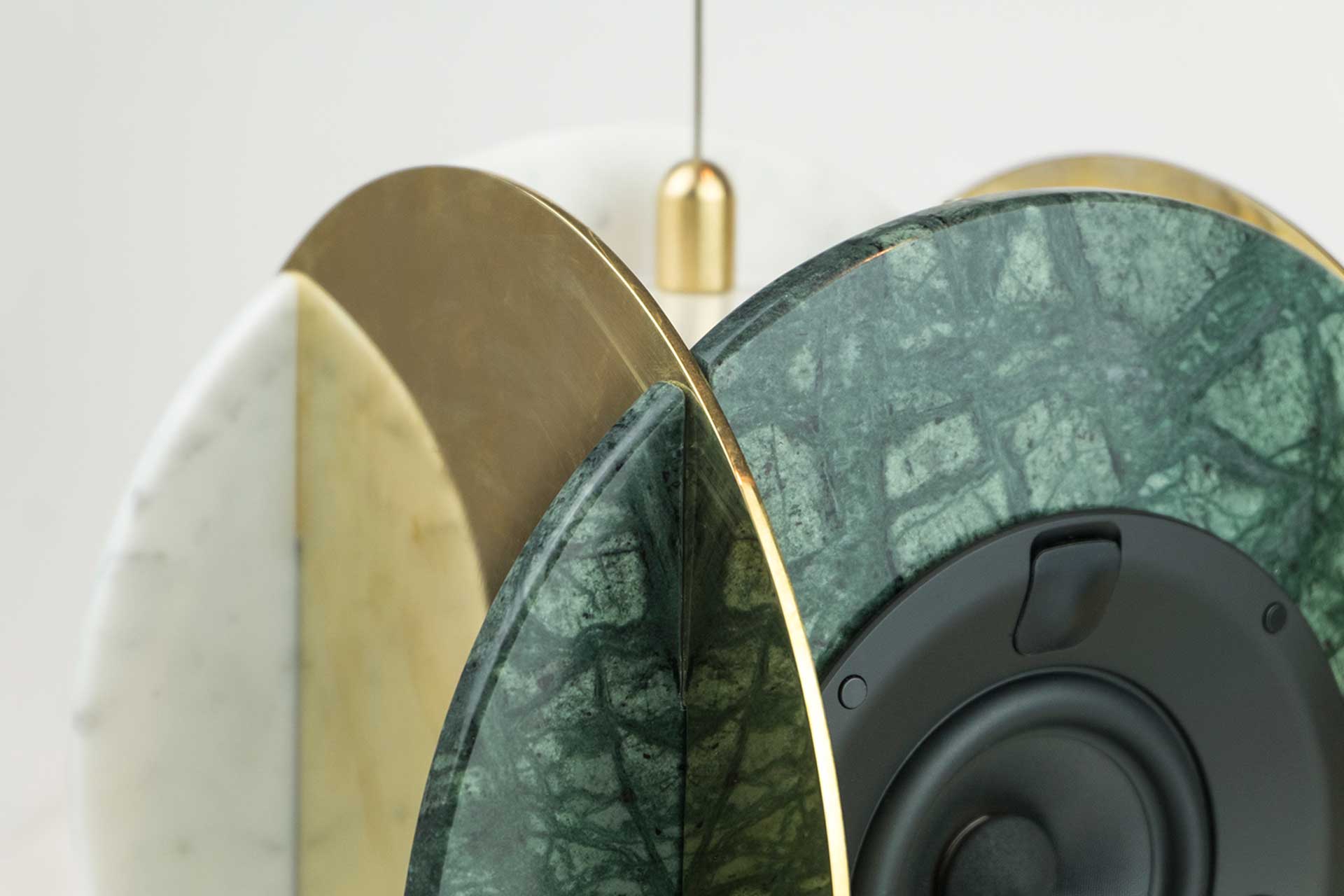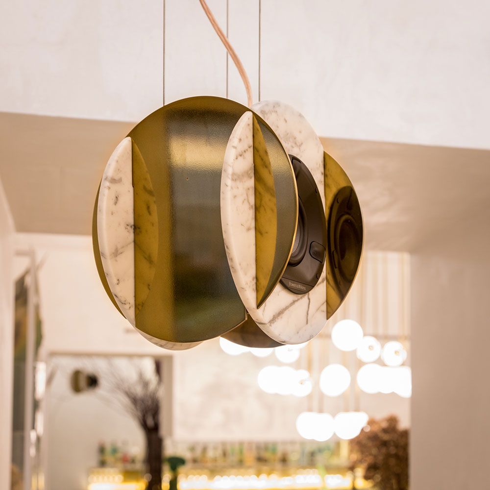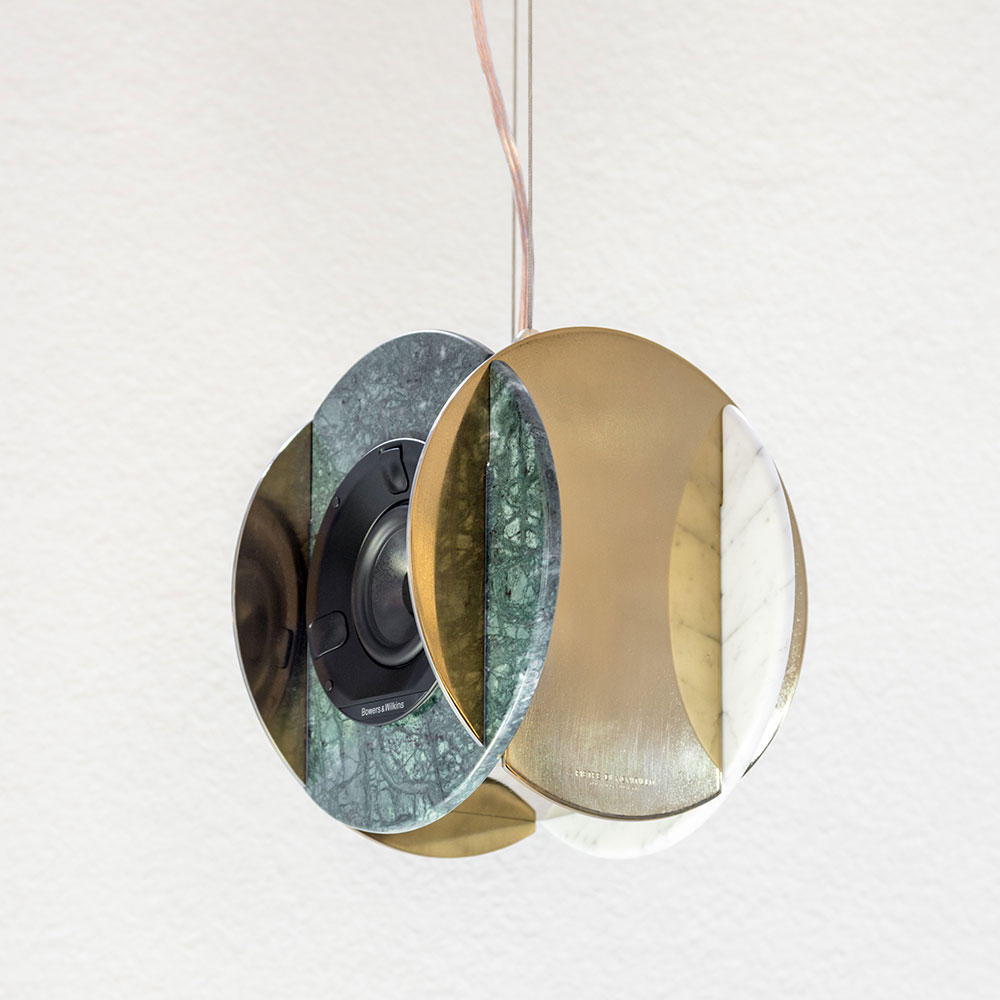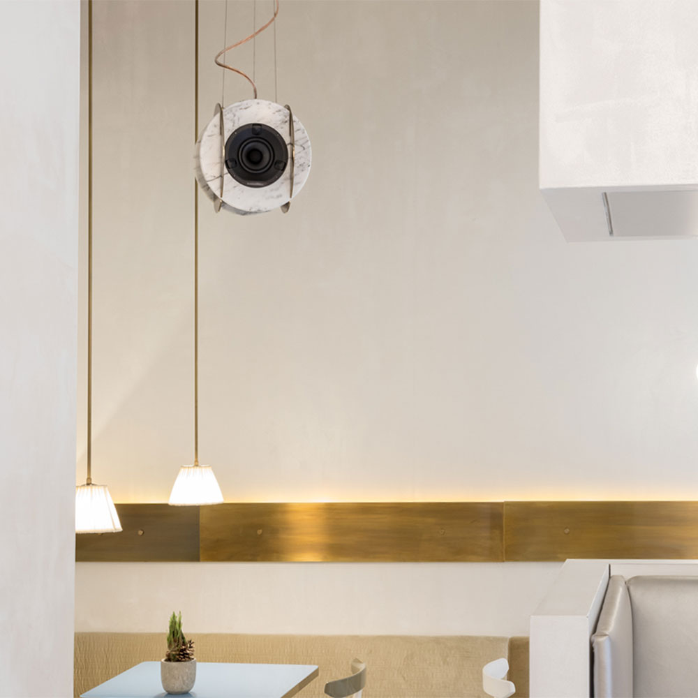 Senato speaker is born thanks to a partnership with Senato Hotel Milano and leads to a completely renewed sound system for the public areas of the milanese hotel. Pietre di monitillo‘s speaker wishes to embody the beauty of the invisible, to provide weight to the majesty of good sound through noble materials. Marble is ideal to amplify sound waves thanks to its compactness and homogeneous composition and is insensitive to structural decay, and metal — largely used in musical instruments — obtains crisp vibrations. Both provide an ideal environment for the bowers&wilkins internal components. The marble elements are available in different configurations, as well as the internal components. any marble disc is cut out from a slab, and finished by hand. senato speaker comes with steel cable lines and brass elements for suspension at roof distance varying from 20 cm to 200 cm.